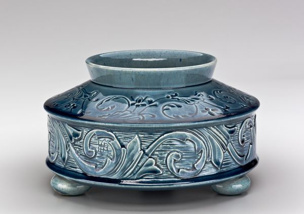 Editor: So, this is a covered cosmetic box with carved décor, made around the 12th century. It’s ceramic, and housed at the Minneapolis Institute of Art. I’m struck by the intricate detail; it seems so delicate and almost fragile. What are your first impressions? Curator: The object itself provides us entry into considering class and gender. Cosmetic boxes in 12th century Korea speak to me of highly stratified societies and expectations of feminine identity. I’m curious, what do you make of the colour? Editor: Well, it seems almost celadon, that pale green shade... Is it intentional, a reference to jade perhaps? Curator: Precisely! Celadon glazes, revered for their resemblance to jade, were highly prized. Now consider who this was made *for.* Celadon ware, especially something as intricately decorated as this, signalled luxury. The women using this box may well have had some social status, some control over their presentation to the world. Editor: So, this wasn't just a practical item; it's a symbol of identity and social standing? It feels almost subversive, that such care and artistry were lavished on something so intimate. Curator: Exactly! Objects like these embody a silent dialogue about beauty standards, social mobility and perhaps even resistance against those expectations, offering glimpses into women’s daily lives in ways that written historical records often omit. The fact that such an object *survives* speaks to care, to the recognition of worth and preservation through the generations. Editor: I never thought of it that way. I was only thinking of the craft. Curator: Always ask *cui bono*; "who benefits?" Look for silent agendas. Art whispers its secrets if you lend an ear. Editor: I will. Thank you, that's really opened my eyes.
