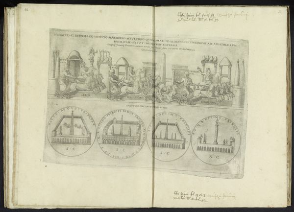 Curator: This intriguing image, created around 1580 by Onofrio Panvinio, is titled “Putti als wagenmenners”, or “Putti as Charioteers.” It’s rendered in ink on paper, and seems to depict scenes related to chariot racing, with putti or cherubic figures acting as the drivers. Editor: The sketchiness immediately gives it a dynamic, almost frantic energy. The compositions are fascinating - crowded and a bit unsettling with these cherubic figures wielding such power. What's the story it's trying to tell, politically and culturally? Curator: It's worth situating Panvinio within the cultural milieu of the late Renaissance. There was intense interest in classical antiquity at that time, so scenes related to classical events and figures are quite commonplace. It is highly likely he was influenced by this social and cultural environment, which would explain his theme and his employment of figuration, particularly with the “Putti as Charioteers.” Editor: And I would suggest that these images present conflicting signals, these babies seemingly controlling such massive power…How were people intended to read that? Was Panvinio attempting to disrupt a system through this juxtaposition, a means of engaging in identity politics, perhaps? I'm struck by what this may mean relative to the way that power, historically, has been centralized. Curator: It’s possible to view these charioteers as symbols, drawing parallels between religion, philosophy, and Roman governance. Perhaps his intended audience in the church understood the relevance in late Renaissance Rome, I’m less certain that Panvinio himself did, based on our sources and documentation of his intent. He may have simply been influenced by the tastes of his patron at the time. Editor: That makes me think about the institution itself, in terms of its gatekeepers. It goes to show just how significantly that affects whose narratives are lifted, and which ones are, instead, lost in time, given he seems to be in favor of "gatekeeping". Curator: Indeed. Context informs everything when we look at a piece. Even a seemingly straightforward sketch offers a window into a whole world of power dynamics and artistic choices. Editor: I appreciate that your focus on the social framework provides an opening to analyze its power structures more comprehensively. It allows us to see Panvinio, his audience, and perhaps the very purpose behind the sketch through fresh eyes.