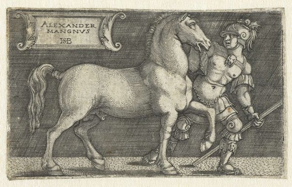 Curator: This is Sebald Beham's "Alexander the Great with His Horse Bucephalus," a small engraving measuring just 4.5 by 7.5 centimeters. Editor: What strikes me is the sheer intensity, a raw muscularity rendered in such meticulous detail despite its miniature scale. It's as if Beham wants to trap Alexander's formidable presence in a tiny box. Curator: The dense cross-hatching certainly contributes to that sense of contained power. Note how the lines follow the contours of the horse and rider, building volume and suggesting movement within a static medium. Editor: It’s interesting, isn’t it? How such a rigid technique can still convey a sense of wildness. Alexander is practically bursting out of the frame, and even the horse looks like it could bolt any second. Curator: I agree. The composition is tense. Beham masterfully uses line to generate both form and a palpable sense of energy. Editor: It makes you wonder what stories it has to tell, this tiny titan, trapped between worlds. Curator: Indeed, and it gives us much to consider about the nature of artistic power itself.