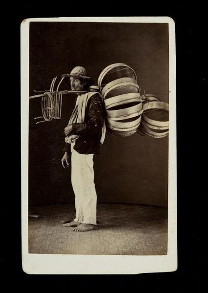 Curator: A.J. Rapozo's photograph, titled "Costumes of Michaelenses, Azores, Portugal," captures a woman in traditional dress, balancing a large wicker basket on her head. Editor: Immediately, I sense such quiet strength in her stance; it's a portrait that speaks of resilience, burdened yet unbroken. Curator: Indeed, the image resonates with layered implications about gendered labor, and the intersectionality of identity within colonial contexts. The photograph's composition—the basket a physical and symbolic weight—demands that we confront historical power dynamics. Editor: The way she meets the camera’s gaze feels so direct. It makes me wonder, what was it like for her to stand there, to be seen and, maybe, not really seen at all? Curator: These photographic portraits were often ethnographic studies aimed at documenting and categorizing populations within colonial territories. It can be difficult to separate that intention from the resulting image. Editor: Absolutely, it's a complicated tension. Looking closely though, I feel a sense of her own personal dignity shining through. It's a testament to her spirit, captured almost in defiance. Curator: It’s crucial to acknowledge that tension, and to approach historical photographs with a critical awareness of the power structures at play. Editor: Thinking about it, I realize I'm seeing a powerful act of self-representation, even within the constraints of the photographer’s gaze. Curator: Precisely, it's in those nuances that we uncover richer understandings of history.
