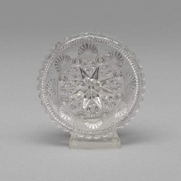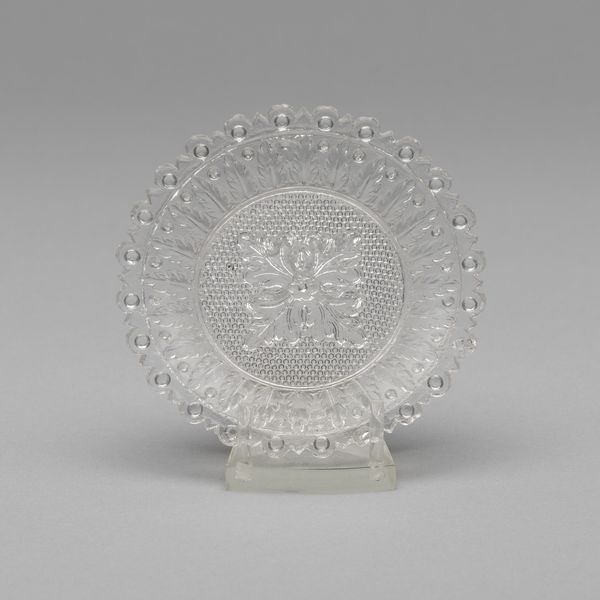 This cup plate of unknown date was created by an anonymous artist and is made of glass. What strikes one immediately is the overall symmetry and the crystalline texture achieved through the molded glass. The play of light across its surface creates an intricate dance of reflections, highlighting the delicate patterns. A central medallion radiates outwards, transitioning into concentric rings of floral and geometric motifs, culminating in a beaded edge. The absence of strong color directs our attention to the formal elements. Line and shape define the object’s aesthetic. This emphasis on form over overt symbolism invites us to consider the plate as a study in structure and repetition. Does the symmetry reinforce a sense of order, or does the subtle variation within the repeated patterns introduce an element of the unexpected? Ultimately, the cup plate’s significance may lie not just in its functionality but also in its capacity to engage the viewer in a visual dialogue about pattern, light, and form.