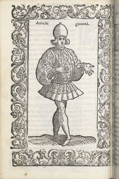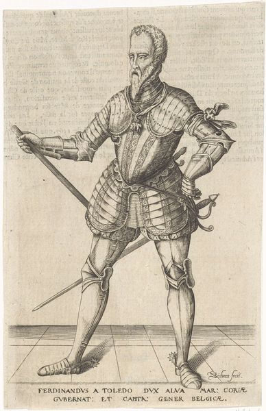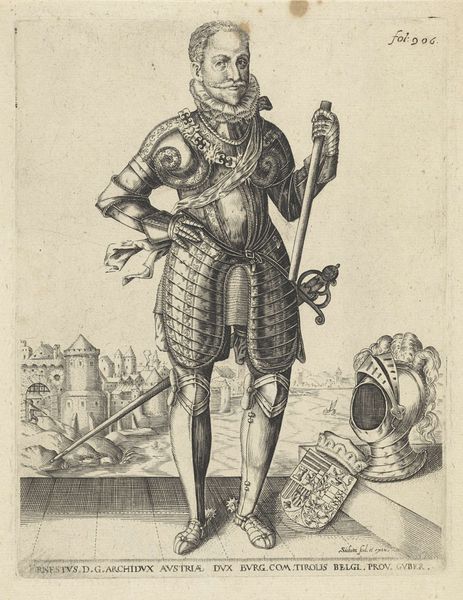 This engraving of an armored figure is by Christoph Krieger. The composition commands immediate attention: a full figure stands centrally, framed by an ornate border teeming with vegetal motifs and classical heads. Notice how the textures vary: from the smoothness of the spear to the detailed chainmail armor and the feathered edges around the waist. These elements contribute to the overall visual interest and tactile sensation, enticing the viewer to look closer. Krieger challenges fixed meanings by embedding classical motifs in the frame, juxtaposing them with the contemporary figure of a soldier. This juxtaposition destabilizes traditional values, suggesting a world where classical ideals are reinterpreted through the lens of military might. Consider how Krieger's use of lines and textures function not merely as aesthetic choices, but as part of a broader discourse. By examining such semiotic systems, the work becomes a site of ongoing interpretation and re-interpretation.