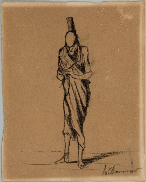 Jean-François Millet sketched "Standing Figure" using black crayon on paper sometime in the mid-19th century. Millet lived during a period of significant social upheaval in France, marked by the rise of industrialization and growing class tensions. This sketch embodies the period's complex relationship to rural life and labor. The figure is stooped over, perhaps burdened by labor or age. The person's identity is obscured, inviting viewers to project their own understandings and feelings about the working class onto the image. Millet’s choice of medium—crayon on paper—adds to the work's accessibility, mirroring his commitment to representing everyday people. Though subtle, the work challenges the traditional romanticization of rural life. Millet prompts us to reflect on the human cost of labor and the dignity of those often overlooked. The sketch, with its raw and honest depiction, invites empathy and recognition, turning the viewer into a witness of the figure's quiet strength and resilience.