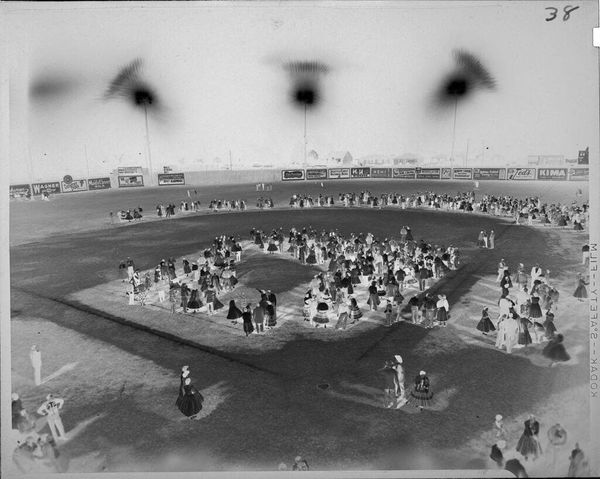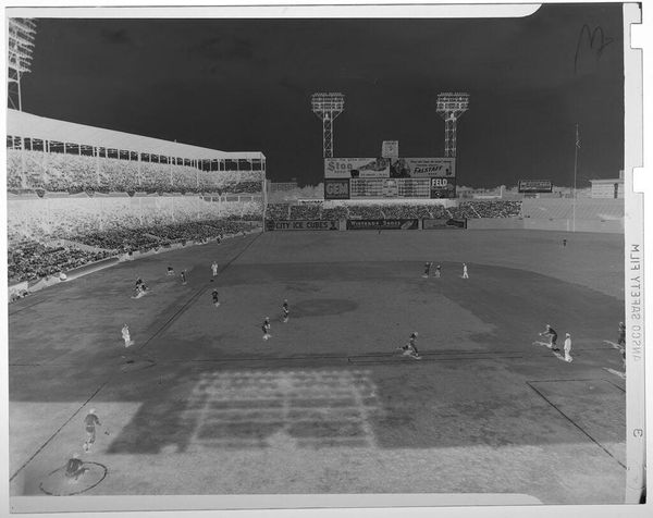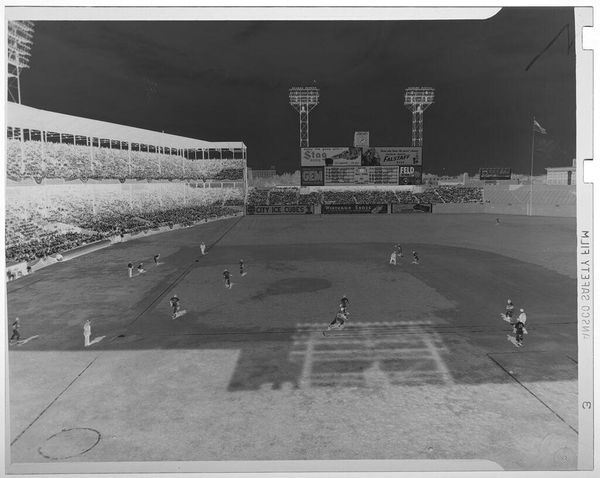 Curator: This photograph by Jack Gould captures a baseball game in a stadium. It’s fascinating how a simple image can reveal so much about a society's values and pastimes. Editor: It’s striking how the composition emphasizes the scale of the stadium and the players seem so small in comparison. What do you think this photograph says about the role of sports in American culture at the time? Curator: Well, large stadiums themselves are civic statements. The photo highlights the spectacle of baseball, but also hints at the commercial aspects with the ads. It implies the sport's deep integration into the economy and social fabric. Editor: That makes me wonder about who this spectacle was for, and who was excluded. Thank you for your insights! Curator: Indeed, examining the historical context of access and representation would offer further layers of understanding.