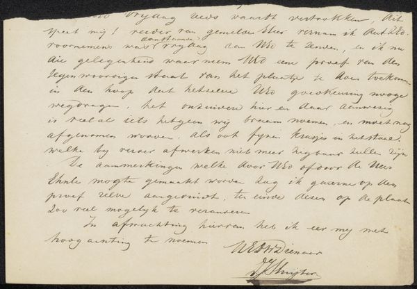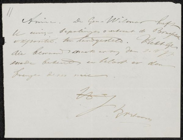 Curator: This unassuming piece is titled "Brief aan Lambertus Hardenberg (1822-1900)," dating from 1827 to 1891, created by Johannes Bosboom. Editor: The first thing that strikes me is the intimacy. It’s on a small scrap of paper, and the handwriting seems very personal and informal, as though dashed off in haste. Curator: Absolutely. Bosboom crafted it using ink and watercolor on paper. Given its appearance, we can fairly safely assume this served as something like a preliminary study or personal sketchbook entry, giving us unique insight into the mind of the artist. This likely means it lacks the kind of rigid posing one would expect. It’s spontaneous, not for public consumption. Editor: The visual weight seems significant. It makes me wonder about the significance of written communication during that era and its relationship with community formation. Curator: The content of the letter is pretty mundane by all accounts, but is itself symbolic: It reads, more or less, as just everyday chitchat; a quick line to Lambertus to ask whether they can reschedule for a meetup over lunch and a little chat, that seems to have been set up originally for the previous Friday, because the writer had some errands. Editor: Mundane it may be, yet that's the kind of art I really appreciate. Ordinary communications taking on cultural symbolism from sheer temporal displacement. It reminds us of the human touch that digital communications are leaving behind, that is very personal and vulnerable at once, particularly resonant when the text fades, mirroring memory's own decay. What will that mean for us? Curator: True, the medium itself becomes significant. In a time before instant communication, such a handwritten note would carry more weight, representing intentionality and connection. The Dutch Golden Age calligraphy itself, beyond the message, embodies the era's commitment to artistry in everyday life, as ordinary objects carried symbolic, personal meaning. Editor: Ultimately, it's a powerful reminder of lives lived and connections maintained, all captured in this one little piece of ephemera. Curator: I concur, this work makes us ask so much about historical artistic expression and makes it into an amazing portal for contemplating these complex themes.