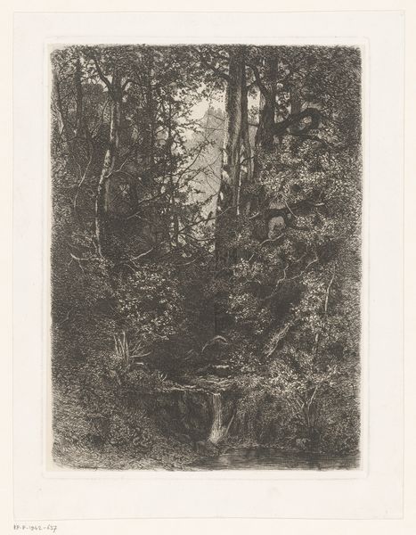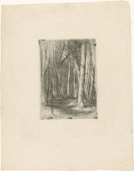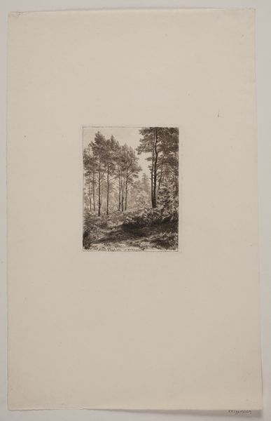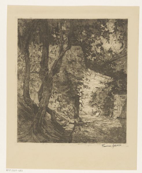 Jean Alexis Achard created this etching, called ‘Bosgezicht’, during the 19th century, a period defined by shifting social structures and the rise of industrialization. Achard, working within the established artistic norms of his time, offers us a glimpse into a wooded landscape. But it’s not merely a scene of nature; it’s an exploration of space and identity. The density of the trees, the path leading into the unknown, all evoke a sense of introspection. The landscape becomes a mirror reflecting the viewer's own position in society. How do we navigate spaces defined by both beauty and constraint? Looking closely, notice how Achard uses light and shadow. The emotional weight of the forest is almost palpable, a reminder of the human presence within the natural world. This image invites us to consider our relationship with the environment, and how it shapes our understanding of ourselves and the world around us.