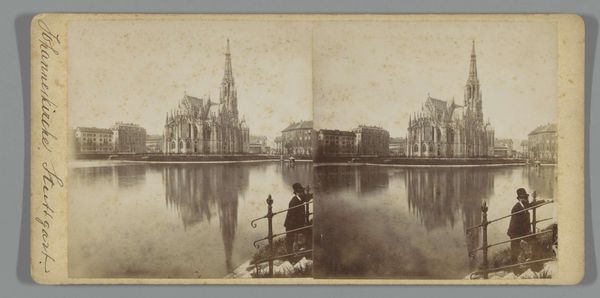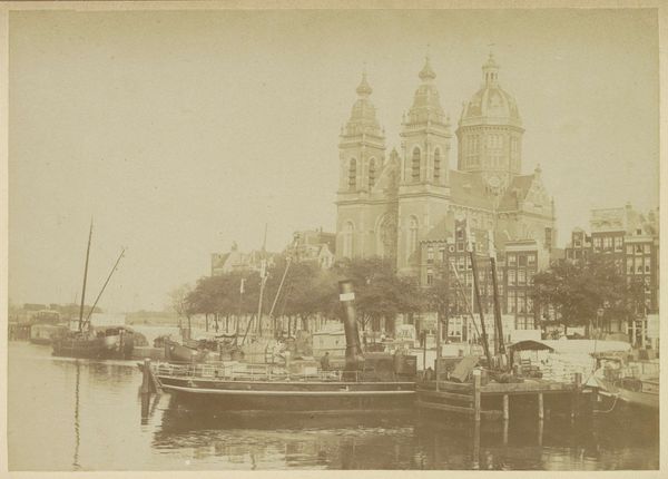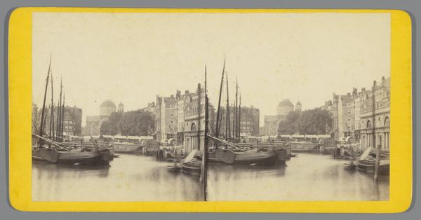 This is Andries Jager's photograph "Gezicht op de Prins Hendrikkade en de Nicolaaskerk," taken sometime in the 19th century. The sepia tones create a muted, almost dreamlike atmosphere. The composition is structured by the strong vertical lines of the Nicolaaskerk and the masts of the ships, contrasted by the horizontal expanse of the Prins Hendrikkade. Jager's approach to this subject is interesting for its balance between architectural detail and atmospheric effect. The meticulous rendering of the church's facade is set against the softer, more diffused treatment of the sky and water, creating a semiotic tension between the solid and the ephemeral. Here, photography serves not just as a record but as a medium for exploring perception and representation. Notice how the subdued tonality unifies the disparate elements of the scene. This creates a sense of harmonious, albeit melancholic, unity, suggesting a cultural discourse where precision and artistic impression converge. The photograph invites us to consider how such structured formalism reflects the social values and aesthetic preferences of its time.