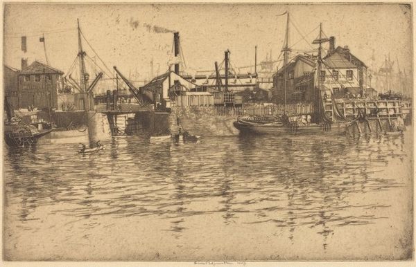 Curator: George Davison's "Wyvenhoe on the Colne in Essex," a gelatin-silver print from circa the 20th century, captures an English cityscape with intriguing depth. Editor: It's misty, almost ghostly. All muted tones, blending into each other. It gives me a melancholy feeling, like a faded memory. Curator: Indeed, the hazy quality aligns with pictorialism, where photography aimed for artistic effect rather than mere representation. The social and economic context of late 19th, early 20th-century industrialization and urbanization in England shaped aesthetic movements like pictorialism. We can read it as an escape, an attempt to beautify the often harsh realities of industrial landscapes. Editor: It's like someone smudged the edges of reality, softening the blow of progress. I like how the horizon is heavy and dark, whilst the land looks quite soft and bright - creates this beautiful feeling of uncertainty to it. Makes you want to sink your toes into the sandy earth and reach into that horizon and maybe just disappear. Curator: I see what you mean. Davison's emphasis on atmosphere can be read through lenses of class and power, reflecting perhaps the bourgeois anxieties and nostalgia prevalent during rapid social change. Pictorialism served as an attempt to create aesthetic value in industrializing space - imbuing landscapes with personal affect in a time of ever increasing objectification. Editor: Nostalgia is a big feeling when looking at it; as if these moments we often disregard are now worthy to look back to, even romanticizing them, when the feeling may be completely contrary when witnessing in real time. It's almost a dare from the author of, "Are you sure you appreciated that? Did you cherish it?". Curator: And it also suggests the power dynamics between human experience and nature’s representation in photography, reminding us to question whose perspectives are being foregrounded. Editor: A good food for thought before snapping the next cityscape photo, then. It feels like the artist attempted to show, using monochrome hues, what can only be truly felt in color. Curator: Exactly! This piece underscores the value of continually critiquing and historicizing not only what we see, but also how we come to see it. Editor: Well, Davison definitely stirred something in me today. Made me want to chase sunsets, capture moody weather, and remember that even dust has its story.