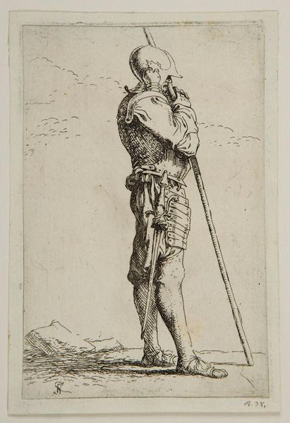 This is Frederick Bloemaert’s etching "Standing Man," created sometime in the 17th century. Bloemaert was part of a generation of Dutch artists grappling with the legacy of the Golden Age, a period marked by economic prosperity but also profound social stratification. Here, Bloemaert presents us with a figure whose identity is both asserted and obscured. We see a man, staff in hand, turned away from us. His clothing suggests a life of labor, yet there's a certain poise in his stance. The snake could symbolize a range of things – temptation, healing, or perhaps the hidden dangers lurking beneath the surface of Dutch society. Bloemaert, coming from a family of artists, would have been acutely aware of the power dynamics at play in the art world and beyond. This piece invites us to consider the complexities of identity and the ways in which individuals navigate a world shaped by both opportunity and constraint. It’s a quiet, contemplative work that hints at the stories of those often unseen.