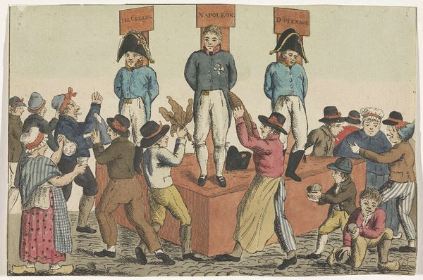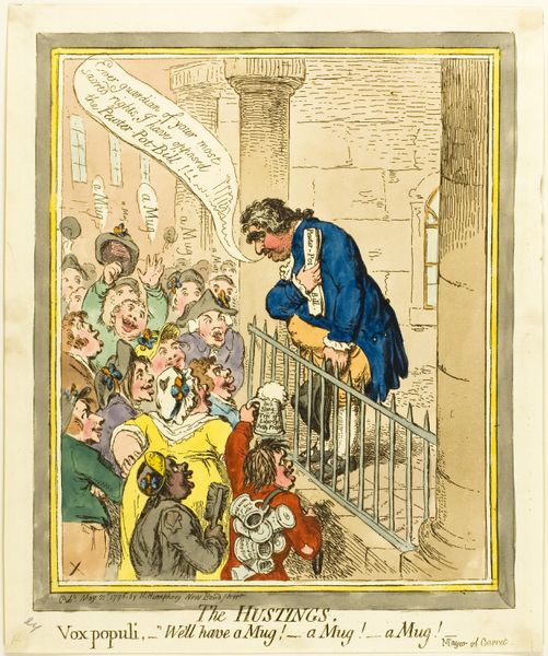 James Gillray created this hand-colored etching titled "Election Candidates" sometime in the late 18th or early 19th century. During this period, satirical prints like this one served as a powerful form of social and political commentary. Gillray uses caricature to critique the political figures and factions of his time. The print depicts a chaotic scene of individuals attempting to climb a pole, symbolizing the pursuit of power or success. The figures represent recognizable political personalities, their exaggerated features and actions reflecting Gillray's critical perspective. The "Republican-Goose" at the top embodies vanity and unattainable ideals. Gillray often targeted those he viewed as corrupt or opportunistic, skewering their ambitions and exposing their flaws through biting satire. But it also speaks to the lived experience of the common person during this time; the pursuit of reform. Gillray’s work is a window into the past, offering insights into the social and political dynamics of his era, revealing the timeless nature of political ambition.