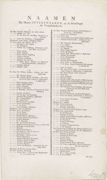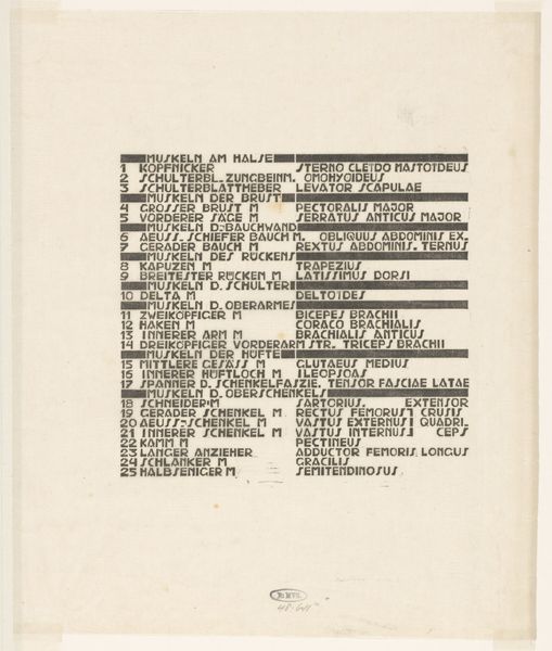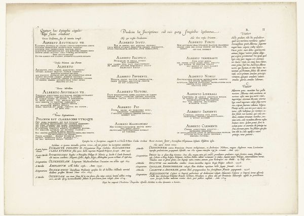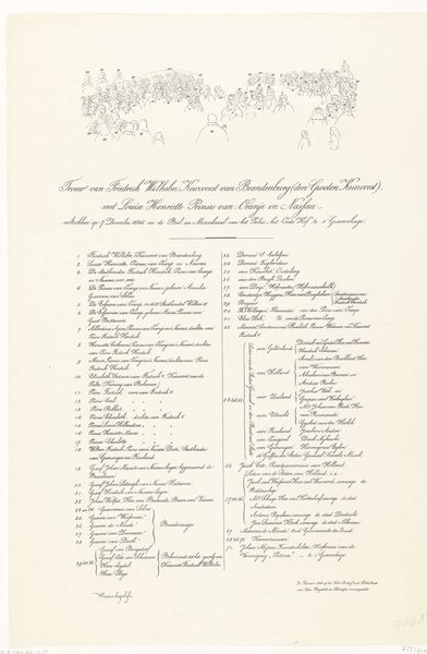 Editor: Here we have “Namenlijst van de groepen in de Delftse optocht, 1862,” by H. Nijgh, a printed poster currently held at the Rijksmuseum. It seems purely informational, a long list organized in columns. How might we analyze this through a formalist lens? Curator: Indeed, let's consider the elements. Notice the deployment of typography; its regimented layout establishes a clear hierarchy. Each name, meticulously typeset, contributes to the overall grid-like structure. Consider the negative space, how it delineates and frames each section. Editor: The arrangement is almost architectural in its rigidity. But what is the effect? Curator: Precisely. The impact is one of order and control. Observe how the variations in font size denote differing levels of importance. The uniformity speaks to the collective endeavor, emphasizing the structure over the individual. Can we say this suggests a celebration through formal means? Editor: I see how the deliberate use of space and the uniform font contribute to a sense of collective identity rather than individual expression. The organization becomes the message. Curator: The formal attributes serve not just as carriers of information, but also creators of meaning. We must look to the relationship between these aesthetic components. Consider how the repetition of names within this structure offers a compelling interplay of figure and ground, information and abstraction. What new avenues of exploration might this stimulate in your estimation? Editor: It's remarkable to consider how the structure transforms a mere list into an artifact rich in potential interpretations. Curator: Precisely. A keen observation on how artistic intent and visual representation might intertwine with one another, as well as impact any viewer in general.