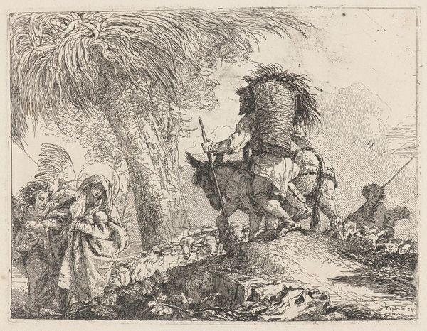 Giovanni Domenico Tiepolo created "Joseph and Mary Prepare to Leave" using etching to produce intricate lines and tonal contrasts. This artwork captures a tender moment with the Holy Family depicted against a backdrop of rustic simplicity. The composition is structured to draw the eye towards the figures of Mary, Joseph, and the infant Jesus, as they are bathed in a gentle light that contrasts with the darker, more densely etched areas surrounding them. Tiepolo’s use of line is particularly striking; short, quick strokes create texture and shadow, building form and depth with remarkable efficiency. The figures are rendered with a naturalism that is softened by the overall atmosphere, creating a sense of intimacy and quiet anticipation. The careful arrangement of light and shadow guides our attention, while the dynamic lines suggest movement and transition. This etching not only showcases Tiepolo's mastery of the medium but also invites contemplation on themes of family, faith, and the human condition. It reflects the period’s emphasis on emotional engagement.