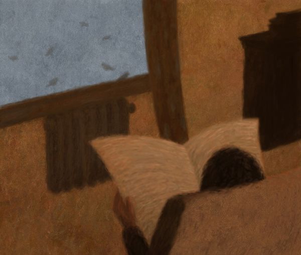 Editor: This painting is called "Newspaper" by Iwo Zaniewski, and it's done with acrylic paint. There's such a stillness to the scene – someone's reading, maybe late at night. The composition is interesting. How would you interpret this work, seeing the interior that includes a bed? Curator: The scene resonates with the concept of domesticity. It feels like the painting might comment on the evolving roles of domestic space, especially within a shifting sociopolitical sphere. This scene represents the refuge where personal information is absorbed. Do you think the inclusion of the bed is an overt nod towards safety? Editor: It definitely evokes safety and quiet introspection. Maybe the newspaper, in contrast, represents the outside world intruding into that safety? Curator: Precisely! Think of newspapers at the turn of the century: mass media entered homes rapidly, influencing private and public opinion simultaneously. By placing the 'newspaper' in a room designed for tranquility, Zaniewski challenges us to confront this interaction and consider what elements we use for both shielding and opening up our viewpoints. It brings into focus not only what we are viewing, but also, how it impacts a protected space. Editor: That’s such an interesting way to consider it. I hadn't thought about it in terms of social commentary. Curator: Consider also the stylistic blend. There’s a raw realism mingled with a heavy expressionistic quality, giving off both accurate portrayal, yet also a somewhat tense and brooding aura. What impact does this merging have in its setting? Editor: I think the mix definitely amplifies the tension you described earlier; that outside force creeping in from those pages really contrasts. Curator: It underlines the constant negotiation we undertake between privacy and the public sphere. Editor: This piece really gets you thinking about how outside forces affect one's most intimate spaces. Curator: Indeed. It speaks volumes about the power dynamics woven into seemingly ordinary moments.