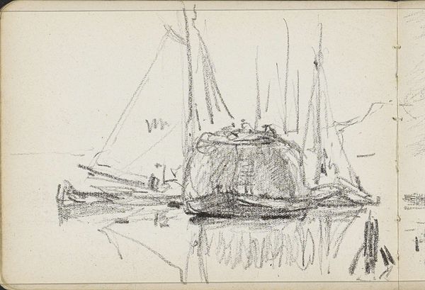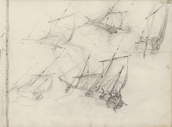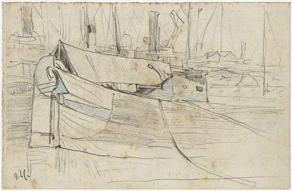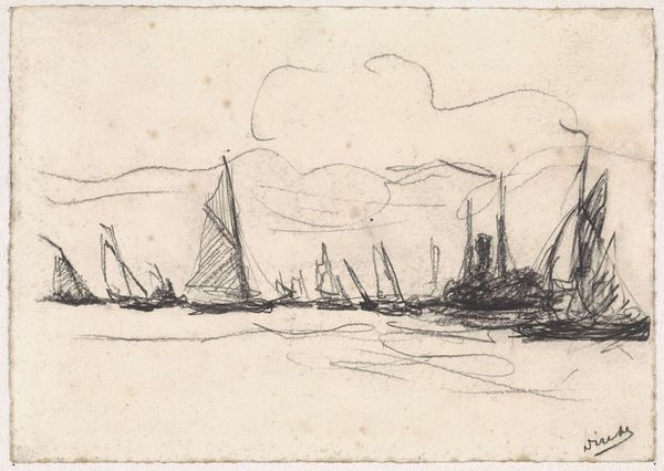 This drawing of a steamboat was made by Anton Dirckx, using graphite on paper. The material is simple, the kind available to anyone, but it's the artist's mark-making that brings it to life. Notice how the sketchy lines capture the dynamic energy of the scene. Dirckx doesn't give us every detail, but rather suggests the boat's form and movement through a flurry of marks. The steamship itself is significant. As a mode of transportation, it symbolizes progress, industry, and connection. It also speaks to the labor involved in building, maintaining, and operating these vessels. Dirckx’s quick, almost frantic strokes may reflect the fast pace of industrial life at the time. The drawing isn't just a picture of a steamboat, it’s a record of the artist's experience, rendered with a humble material but a powerful sense of immediacy. It blurs the line between fine art and everyday observation.