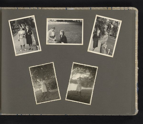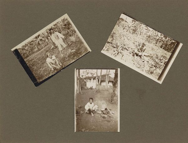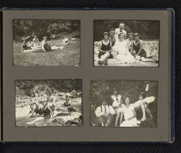 Curator: These gelatin-silver prints collectively titled "Zeven portretten van Herman Besselaar en kennissen in een tuin en in een bos", which translates to "Seven portraits of Herman Besselaar and acquaintances in a garden and in a forest," were captured around 1930 by Berti Hoppe. There are seven separate photographs laid out, each showing the sitter or sitters surrounded by nature. Editor: My first thought is of how intensely these little tableaus portray intimate lives within constructed, almost theatrical, natural settings. There’s such formality mixed with playfulness. Look how deliberately staged each group is, yet the subjects, particularly the children, have a casual freedom about them. Curator: The composition definitely enhances that impression. Hoppe seems conscious of inherited visual grammars – pastoral scenes, perhaps – yet subtly subverts the associated visual motifs with her use of cropping, a tight focus, and that monochrome palette that lends the whole piece a dreamlike distance from the present day. I keep returning to the one photograph where several men stand amongst the towering trees and a little boy sits at their feet. It is almost biblical in its placement of humanity amongst nature’s grand cathedral. Editor: Absolutely, but within this sense of staged solemnity I see something more complex too. In a politically tumultuous time period in Europe, finding peace within natural settings could become an act of resilience, and this form of visual storytelling serves as a gentle political narrative, prioritizing rest. Curator: It highlights a kind of return to Eden before more turbulent days, and one can find a certain longing embedded in each scene of verdant enclosure. It speaks of a fundamental yearning for innocence but rendered with such awareness that its message gains power. Editor: Agreed. Ultimately, for me, these scenes function almost as archival resistance—softly celebrating human life against a backdrop of increasingly fraught political discourse. What begins as a quiet photo album speaks volumes on human relationships, childhood and political unrest. Curator: Seeing them this way casts a new light on these quiet moments. Thank you for drawing my attention to this work’s subtle layers of historical and social discourse.