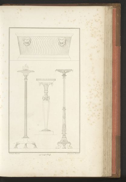 Curator: Take a moment to observe this print titled "Journal des Luxus und der Moden 1786, Band I, T. 22," dating from 1786, created by Friedrich Justin Bertuch. It’s an engraving featuring ink on paper. What is your first impression? Editor: Stark simplicity. Almost… diagrams for interior design, perhaps? The fine lines, rendered in pen, are so precise they feel more like technical drawings than decorative art, despite the subject matter. Curator: Indeed, these were published in a luxury and fashion journal. It speaks to the emergent Neoclassical style. Notice how the print renders three different designs for light fixtures: a chandelier, a wall sconce, and a pendant. Consider how such designs signal the symbolic shift toward clarity, order, and a revival of classical motifs after the excesses of the Rococo era. Editor: Right. And what I notice is the process, and specifically the labor implied in their production and then consumption. Each of these fixtures required not only the design itself, made into an engraved and published image, but a metal worker, probably bronze or ormolu based on what would be available at the time, who then could produce something identical. It’s not simply about aristocratic refinement, it’s a glimpse into specialized manufacturing practices becoming intertwined with fashion itself. Curator: It is fascinating how prints like these allowed the dissemination of style across regions, fostering cultural homogenization to a degree. These fixtures, rendered in ink, symbolize not just light but also power, aspiration, and connection to the past, where classical forms were reborn. Editor: But this journal also represents a moment when those connections – both literal trade routes for these chandeliers and cultural diffusion, made possible through reproducible media -- became sites of burgeoning industrial practice that often escaped scrutiny at the time. What materials are extracted, what labor is required and exploited in ways made invisible. This print isn’t neutral; it promotes an emerging, expanding capitalist world. Curator: Perhaps that’s why such close observation of visual artifacts becomes crucial. We discern what continuities, traumas, or hopes are echoed through these designed forms. Editor: Precisely. It also prompts a reevaluation of how design functioned – and functions – as a mediator between resources, craft, and aspirations. Thanks for drawing my eye deeper into the materiality beyond just the surface elegance of this piece.