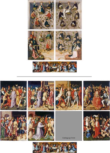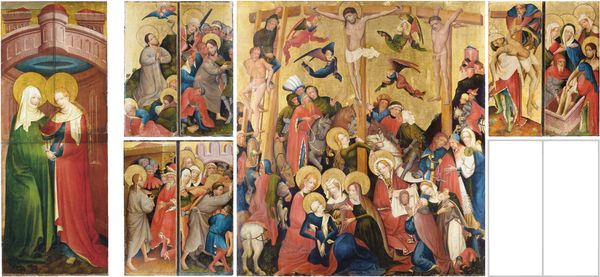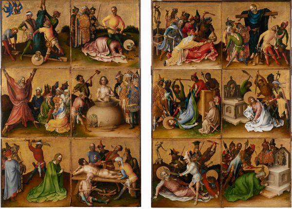 Curator: Let’s turn our attention to this panel by Stefan Lochner: a section of his "Martyrdom of the Twelve Apostles" altarpiece, completed around 1435 for the Church of the Holy Apostles in Cologne. Editor: What strikes me immediately is the composition – a series of meticulously arranged, miniature stages depicting violence, all set against a strikingly flat, golden background. Curator: That gold lends a heavenly, almost Byzantine feel. These small, sequential scenes detailing the apostles' deaths, while graphic, follow established visual narratives of religious suffering. Note how each martyrdom occurs within its own distinct space, separated yet unified within the overall grid structure. Editor: It’s a peculiar mix, isn’t it? The vivid details of torture juxtaposed with these almost idyllic colors. Look at the drapery! Lochner certainly had a talent for rendering volume and texture, but there's this jarring contrast between beauty and brutality. Semiotically, the gold subverts the stark realism of what’s going on. Curator: Absolutely. These colors and symbols, particularly the halos and certain repeated gestures, function as cultural shorthands, allowing the viewer to easily identify the figures and understand the overall message of faith and sacrifice. The continuity lies in the repetition of narrative; consider the placement of the central kneeling figure—likely St. Peter—an act echoing Christ's own agony in Gethsemane. Editor: I find the compression of the figures and architecture curious—how each scene's perspective flattens out instead of receding naturally into space. But Lochner achieves spatiality through a consistent high horizon line—maintaining spatial coherency that lends the image credibility. Curator: Ultimately, this is not just about death; it is about how these deaths secured the spiritual foundation. It's a cultural anchor—reinforcing communal values, resilience, and shared historical narrative within Cologne. Editor: Yes, a visual essay about order and piety in the face of chaos, expressed through Lochner’s studied formality. Each choice contributes toward his unique design. Curator: It is definitely worth some careful consideration as we remember the altarpiece that once was. Editor: I concur. His creative arrangement of such brutality, presented as visual hagiography is thought provoking.