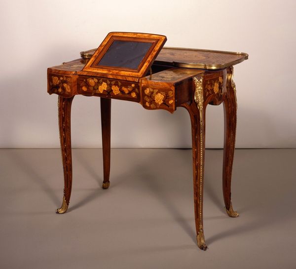 Editor: Here we have Jean-François Leleu’s "Combined Toilet and Writing Table," crafted sometime between 1764 and 1775, primarily using wood. It has a delicate appearance, doesn't it? So many drawers and compartments. What speaks to you when you see this piece? Curator: The meticulous craftsmanship, undoubtedly. Think about the labor invested in selecting, cutting, and joining the different woods, and the skill involved in creating such intricate marquetry. This wasn't simply furniture production, but a statement about the owner's affluence and their engagement with luxury and conspicuous consumption. Consider where those materials were sourced, and who had access to such artistry. Editor: I hadn’t considered the source of materials. Was the availability of such exotic woods limited, perhaps adding to the furniture's value and desirability? Curator: Precisely! And look at the Rococo style. That fondness for curves, ornamentation. Each element represents deliberate consumption choices and demonstrates the client’s position within a stratified economic system. Each gilded bronze element also denotes the high quality of production achieved. Who owned this piece? Can we determine from its construction what its function was for its owner? Editor: The title does suggest multiple uses. Were combined furniture pieces common at the time? Curator: They reflected an elite lifestyle demanding efficiency alongside beauty, indicative of changing societal needs amid growing urbanization and consumption. It shows not just how they lived, but how labor and artistry became a spectacle. Editor: I’m seeing it differently now, understanding this elaborate table as more than a beautiful object – as a marker of production and socioeconomic dynamics. Curator: Indeed. Examining materials allows us a window into social values and the complex dance between creation and consumption.