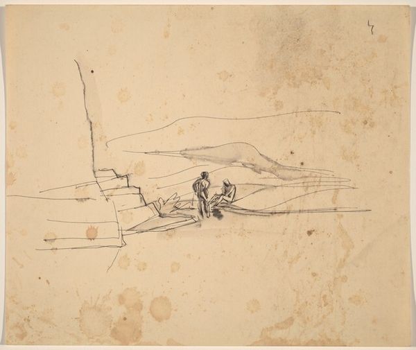 Editor: So, this is "Enkele personen bij een gebouw (doorgestreept)" by Isaac Israels, made around 1888. It's a pencil drawing, currently held at the Rijksmuseum. The sketchiness creates a real sense of transience, almost like we're seeing a fleeting moment captured in graphite. What do you make of it? Curator: What strikes me immediately is the material reality of the production of this drawing. Israels used pencil, a readily available and relatively inexpensive medium, allowing for quick, on-the-spot documentation. The "doorgestreept" in the title—crossed out—suggests a process of revision and editing, a fascinating glimpse into the artist's working methods. Notice also how the blank space of the paper functions almost as a material in itself, defining the figures and the scene as much as the graphite lines. Editor: That's a good point. It does feel quite raw, almost unfinished. How does this relate to the artistic context of the time? Curator: Consider the late 19th century's increasing industrialization. Pencil, as a mass-produced object, democratized drawing, making it accessible to a wider range of people. Israels, as an Impressionist, was capturing everyday life, depicting laborers and ordinary people. The seemingly simple act of sketching these figures is a commentary on the value of labor, rendered with the most basic and accessible of tools. We could see it as a challenge to traditional, academic painting. Editor: So, the very act of using a pencil becomes almost a political statement? Curator: Precisely! It’s about collapsing the hierarchy between "high art" and the art of the everyday, made possible by accessible materials and techniques. Look at the composition itself; the building feels almost skeletal. The human figures, rendered with the same unassuming material, gain prominence and speak to human impact and the experience of observing our constructed world. Editor: That's a really interesting perspective. I hadn't thought about the implications of the materials themselves. I'll definitely be looking at drawings differently now. Curator: Excellent! It is rewarding to think of how much we reveal when considering how artists make their art and interact with our cultures.