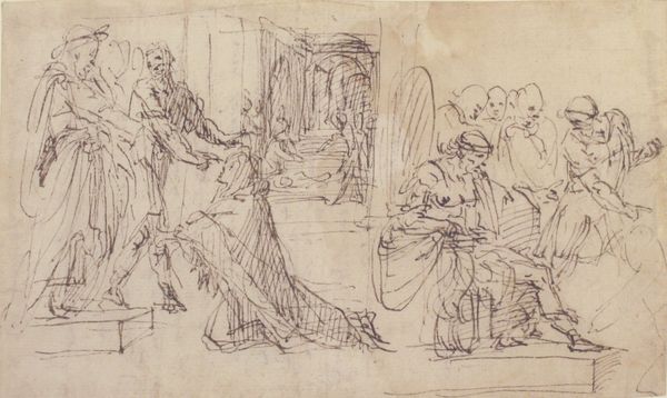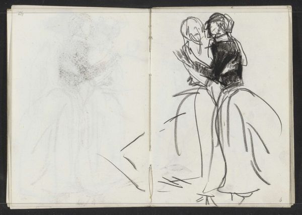 Curator: Before us is "Studieblad met vrouwen en honden," or "Study Sheet with Women and Dogs," by Isaac Israels. Dating from somewhere between 1875 and 1934, it is a pencil drawing currently held in the Rijksmuseum. Editor: My first impression is how light and fleeting it feels. Like catching a glimpse of something rather than a fully realized scene. The figures seem caught in motion. Curator: Israels, closely linked to Dutch Impressionism, captures fleeting moments in modern life, and that comes through so clearly here. Note how he rapidly sketched these women and dogs, testing how to capture them and using an almost shorthand approach. It is as if we’ve been granted a peek inside his mind. Editor: I find the seemingly mundane nature of the subject matter interesting. Fashionable women out for a stroll. I wonder if it is offering any commentary on the social lives of women during that time. The dogs, particularly, feel almost like props here, adding to a scene of leisure and privilege. Curator: Symbolically, dogs can represent loyalty and companionship. Their presence alongside the women suggests a particular social circle. Moreover, the seemingly aimless character of the depiction connects with flâneur culture—that is, aimlessly wandering through urban environments—a theme beloved by the Impressionists. Editor: But beyond social observation, I wonder about the gaze at play here. Who are these women? Are they aware of being watched? It is easy to see these sketches in the historical context of the objectification of women, and this kind of candid drawing can feed into such a dynamic, showing how they are observed and interpreted rather than seeing themselves on their own terms. Curator: That tension is very revealing. Israels offers a fragmented view of society, where the female figure emerges from everyday life yet remains detached and somewhat idealized, if you consider that it is "just a sketch". And although sketchy and perhaps ‘unfinished’, such snapshots were becoming a defining aesthetic in European art at the time. Editor: Yes, and viewing it with those ideas of candid observation, a question comes into play whether we as modern viewers are replicating those unequal power dynamics by viewing such art in our contemporary museum setting. Curator: I hadn’t thought of that, and that definitely offers food for thought. Editor: Exactly. I see so much tension and power in a seemingly simple sketch. Curator: And I see the seeds of a new artistic vision emerging. Wonderful!