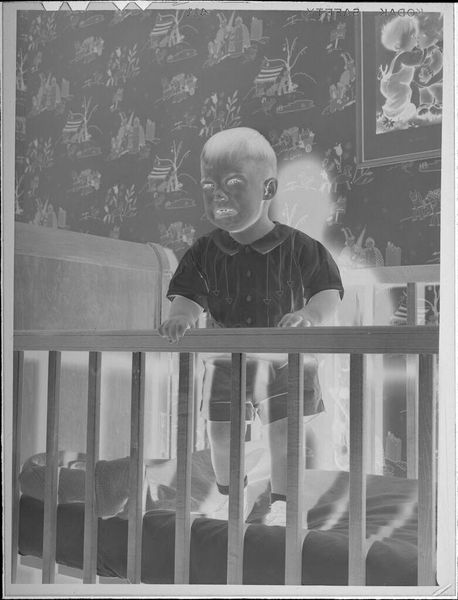Curator: This photograph by Lucian and Mary Brown, simply titled "Untitled (baby in high chair with birthday cake)," is rather striking in its inversion. It's dreamlike, almost unsettling. Editor: The floral backdrop really emphasizes the domestic scene—mass-produced textiles meet a hand-baked cake. Curator: Yes, it's a dance between the ordinary and something more profound. I keep wondering about that single candle, the child’s expression…there’s a story there, isn't there? Editor: Definitely. And I'm drawn to the materiality of it all. The photographic process itself, the cheap film, the studio lighting…it’s all part of the image's narrative. It speaks to the democratization of image-making. Curator: I agree. It's a quiet meditation on fleeting moments and the layers of meaning we give them. Editor: Absolutely, and on the intersection of commercial and personal life.