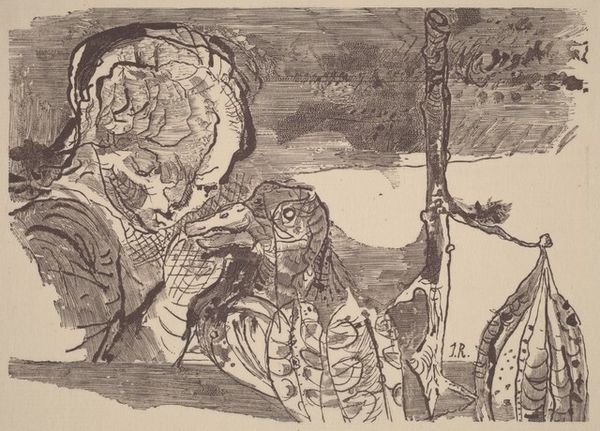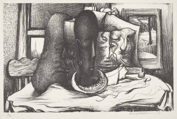 Curator: Welcome. Before us, we have "Creatures," a 1969 mixed-media drawing by Jules Perahim, featuring ink and watercolor. What are your first impressions? Editor: I’m struck by how dreamlike and ominous it feels. The high contrast, the floating figures, and that central, watchful eye create a distinctly unsettling atmosphere. Curator: Indeed. Perahim’s work, especially during this period, grappled with the anxieties and uncertainties of post-war Eastern Europe. His biography is key to unlocking some meanings here. Born in Romania to Jewish parents, the traumas of the Second World War were very personal. This impacted his creative expression, informed by leftist politics. "Creatures" is exemplary of a deep discomfort in a social and historical context. Editor: I can see that. The composite nature of the central figure feels almost monstrous, cobbled together from different parts, not unlike a golem, or figures from Surrealist nightmares. It feels like Perahim is exploring the anxieties surrounding identity and fragmentation. Notice the hand that emanates out of the figure's head, with more shapes emanating from its 'speech', reminiscent of a scream. The smaller floating figures beneath it seem helpless. There's definitely an implied hierarchy here. Curator: The symbolism here cannot be divorced from politics. It is a form of social protest, born out of trauma. I also note that Perahim belonged to the Activist Group of Bucharest. Therefore, his images, although surreal, carry a sharp political and social undertone. Editor: The monochromatic palette emphasizes the sense of somberness. The greyscale underscores the theme. This isn’t simply a dream, it’s a loaded commentary. Curator: This is not only a product of its time, but also deeply personal. As the child of Holocaust refugees, he experienced antisemitism directly. It would appear in his drawings later on, although often indirectly. Editor: Absolutely. When considering its various themes and influences, the power of the work is enduring. It transcends the particulars of the artist's life to explore larger concerns of trauma and identity. Curator: Reflecting on it all, this underscores how vital it is to place artwork into its appropriate context, as each symbol builds upon another. Editor: A fitting reflection. It truly exemplifies how symbols and emotion go hand-in-hand through visual expression.