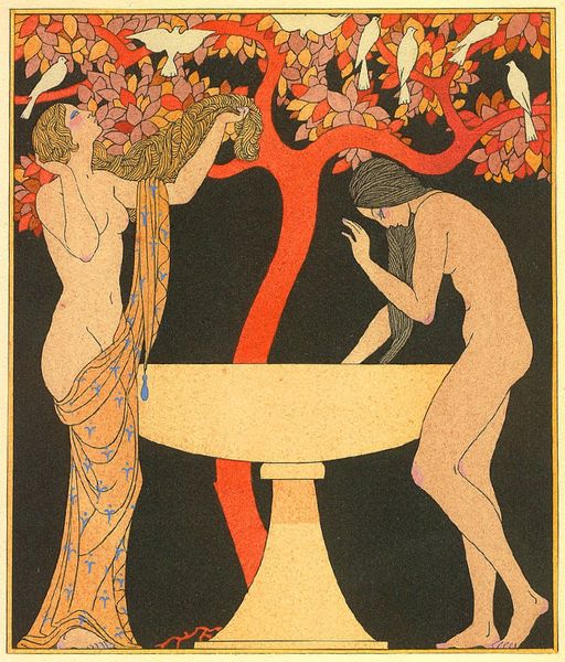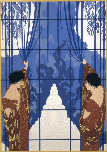 George Barbier created "Les Trois Beautes de Mnasidika," and here we observe the artist's mastery of line and color, elements that define the aesthetic experience of this piece. The figures are rendered with a stylized elegance, their forms outlined with precision. Barbier's use of color is equally striking. A muted palette is dominated by blues and purples. The composition is carefully arranged, with the figures occupying a shallow space that emphasizes the surface quality of the image. The repetition of patterns, from the background wallpaper to the draped fabric, creates a sense of visual harmony. The linear quality and decorative patterns contribute to the artwork's flat, two-dimensional feel, reflecting the influence of Japanese prints and the broader Art Deco movement. This conscious manipulation of form and space challenges traditional notions of depth and perspective. The interplay between these elements creates a sophisticated visual language, inviting us to appreciate the piece.
