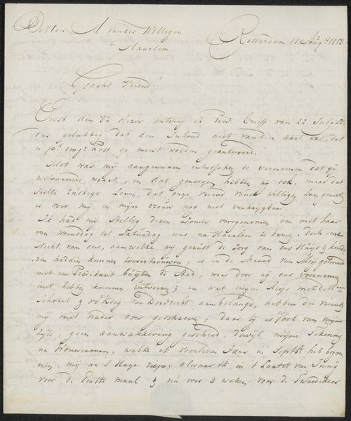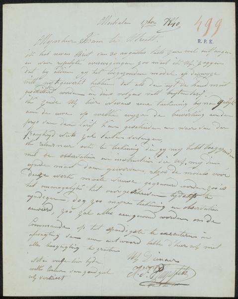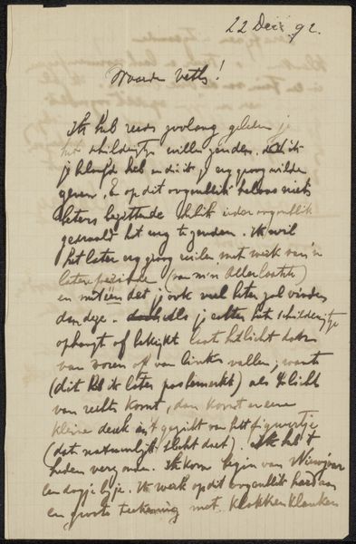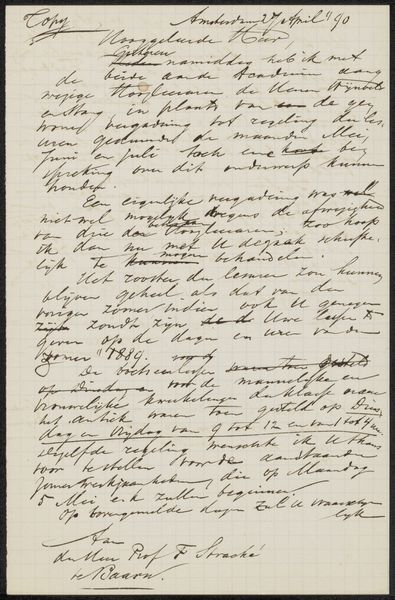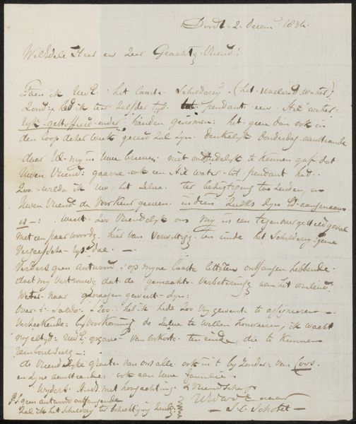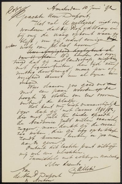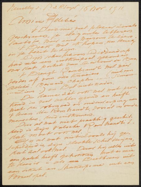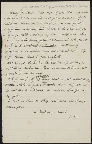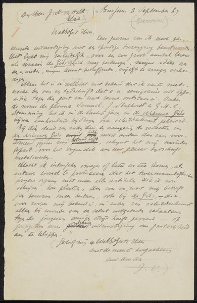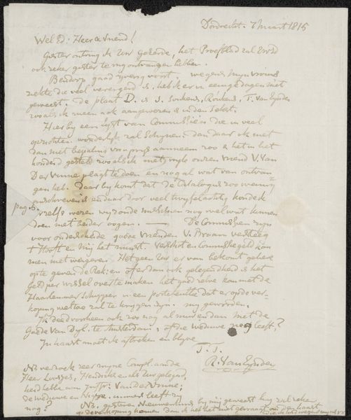 Curator: Today, we're looking at "Brief aan Ary Johannes Lamme," or "Letter to Ary Johannes Lamme," believed to be from 1831, created by Eugène Balan using ink on paper. It is a remarkable example of 19th-century correspondence. Editor: My first impression is one of intimacy, of peering into a private exchange. The faded ink and the fragmented edges give it an aura of fragility, hinting at stories carried within its script. The composition itself is dominated by the weight of text, demanding close reading. Curator: Precisely. Beyond the aesthetic qualities, we need to consider the historical setting. The letter provides a small, personal window into a moment of perhaps political upheaval, reflecting Balan's concerns. Editor: I'm captivated by the handwriting. The cursive flows rhythmically across the page. It seems like an extension of the author’s emotions. How does the use of ink, as a material, contribute to the narrative, setting aside what the text says? Curator: The choice of ink, and its application with a quill, speaks volumes. The darkness and consistency creates a tangible link to Balan’s time. But the visible corrections, cross-outs? They betray a certain haste or internal conflict in its articulation. We also can see how, without access to mechanical reproduction methods, each copy would be different from others in subtle details like pressure or smearing of ink creating something original each time in these small differences from the others Editor: It’s also crucial to think about what a museum does by presenting such a work. We often separate artistic genius from everyday existence, but this is a powerful reminder that creative acts are bound to the contexts of mundane life. Curator: Indeed, by placing the artwork here, we imbue the letter with a renewed sense of significance, encouraging our audiences to consider these artifacts through multiple perspectives. Editor: It invites us to slow down, focus on minute formal properties, and through thoughtful reading—reconstruct fragments from another’s life.