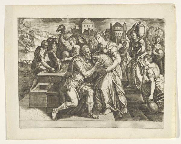 This print, Bruiloft te Kana, was made by M. Preyss. Although undated, the dense lines and careful detail suggest it was produced using an engraving technique. This method involves cutting lines into a metal plate, which are then filled with ink and transferred to paper. The engraver would have used specialized tools to create the textures, patterns, and the illusion of depth. Each line demanded precision and control. The process reflects a significant investment of labor. It is an image of abundance, but is that abundance shared? Notice the clear division of labor in the image, where servers and musicians work to enable the wedding celebration. This is a testament to the socioeconomic structures that dictate who gets to create and who to consume. Ultimately, considering the material and process of this print invites us to think about the social conditions of its making, and the wider world of work it represents.