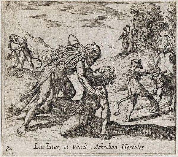 Editor: Here we have Antonio Tempesta’s "Hercules and Acheloüs" made in 1606. It's an engraving, currently held at the Metropolitan Museum of Art. There’s such chaotic energy to the piece. I find it kind of overwhelming at first glance, with all these strange figures interlocked in combat. What's your take on it? Curator: I see an exercise in the craft of printmaking deployed in service of power. The material itself, the copper plate and the act of engraving, becomes a vehicle for disseminating classical narratives, thereby reinforcing cultural dominance. This isn’t just about illustrating Ovid; it's about controlling the means by which these stories are produced and consumed. Who could afford such engravings? What spaces displayed them? Editor: So, you're saying it's not just a piece of art, but also a statement about social standing and power? Curator: Precisely! The labor invested in the intricate details, the implied cost of the materials, all speak to a certain elite class of patronage and consumption. Look at the subject too – Hercules, a symbol of strength, conquering Acheloüs, who has the ability to shapeshift, including transforming into a bull! Even the depiction of these mythical characters reinforces a societal hierarchy of the period. Who benefits from such imagery? Editor: It's amazing how you connect the artistic choices with the social context. I was initially caught up in the drama, but now I see a much deeper game being played out, as you suggest, in labor and materials. It’s not just skill; it is also about class and authority. Curator: Right. By examining the materials, the process of production, and the intended audience, we gain a better understanding of its function within that society. The choice of engraving for mass consumption allowed Tempesta's interpretations to be visible for years, spreading through time and geography. Editor: This has shifted my perspective a lot. Now, when I look at artworks, I'll consider not just what's depicted but how the method itself speaks volumes. Thanks!