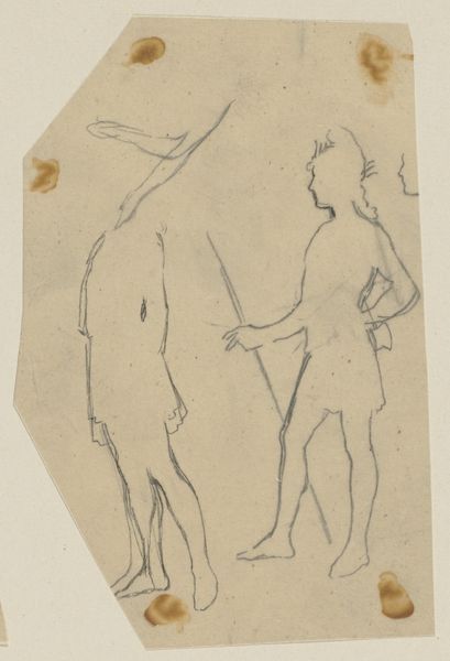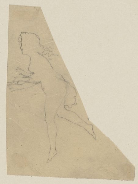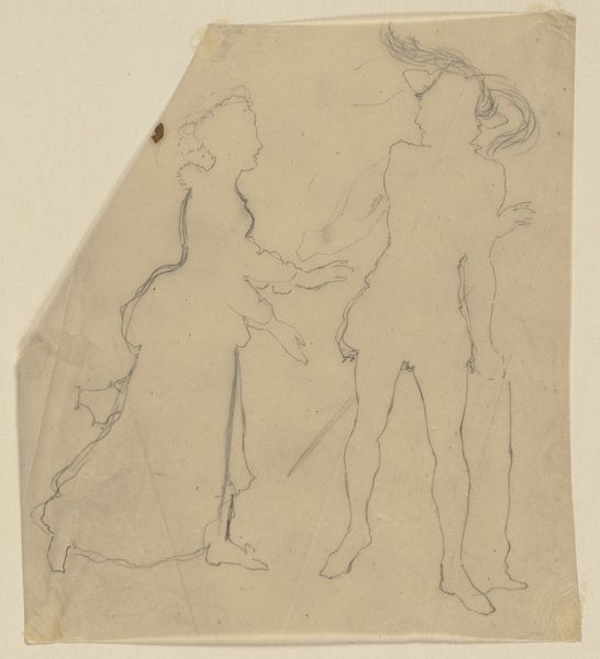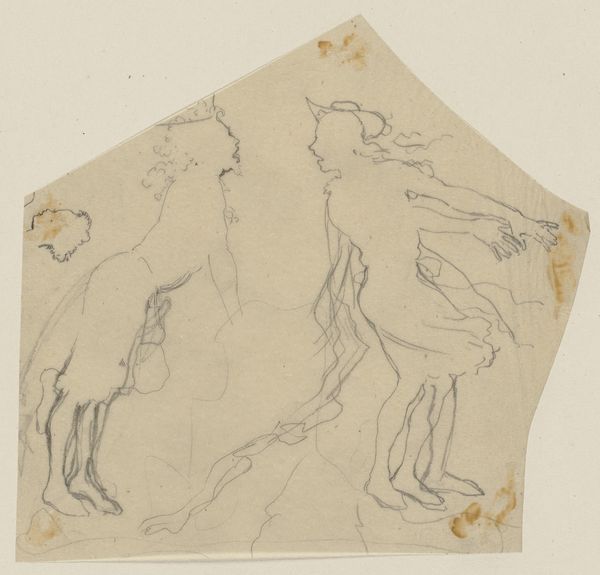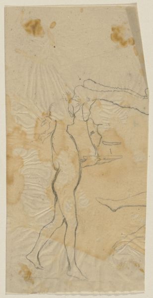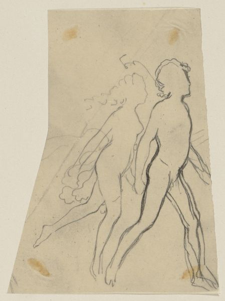 This is Paul Konewka's sketch of Titania and Bottom, now at the Städel Museum. The figures, rendered in delicate pencil lines, emerge from a textured, almost ethereal ground. The composition centers on the stark contrast between Titania's graceful form and Bottom's grotesque donkey head, emphasizing the absurd and dreamlike qualities of Shakespeare's play. Konewka uses line to define shape, but also to suggest movement, particularly in Titania's outstretched arm and flowing drapery. The sketch, though simple in execution, destabilizes conventional notions of beauty and desire. The visual tension between the refined and the monstrous invites us to question fixed categories and explore the transformative power of art. Ultimately, the formal structure of this sketch reflects a larger cultural fascination with the irrational and the subconscious.