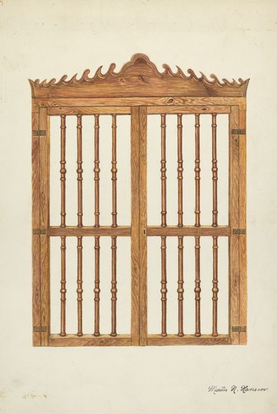 Raymond E. Noble made this drawing of a cabinet, and from the dimensions, it seems to be an idea for a real object, rather than a depiction of an existing one. The sepia tones and regular strokes give the piece an inviting warmth, which could reflect Noble's lived experience as a craftsman. What’s interesting here is the way Noble approaches the depiction of the cabinet, focusing on texture, color, and the physicality of the wood grain. The precision in the rendering of the grain, achieved through fine lines and careful shading, gives it a tactile quality. Look at the panelled doors at the top, notice the subtle shifts in tone and texture – how the artist uses the direction of the lines to suggest depth and dimension. Thinking about artists making objects reminds me of someone like Martin Puryear, whose work also combines handcraft with high art. Ultimately, this drawing reminds us that art is an ongoing conversation.