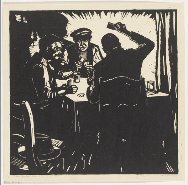 Curator: Here we have Jessie Beard Rickly's woodcut print, "Song of Labor," created around 1930. Editor: Whew, there's so much frantic energy crammed into this tiny black and white world! It's like looking at a city symphony distilled into a stark visual shout. Curator: It's a powerful image reflecting the Social Realist movement's focus on depicting the lives and struggles of the working class during the Depression era. The dense composition emphasizes the relentless activity of city construction. Editor: Absolutely! The woodcut medium is brilliant. It’s such a rough, unyielding technique—perfect for mirroring the harsh reality of labor and the gritty architecture rising around these workers. You can almost feel the vibrations from jackhammers. Curator: Indeed, the figures, almost caricatures of exertion, merge with the skeletal steel structures, highlighting the dehumanizing aspects of industrial labor. It really emphasizes how individuals become subsumed into the vast mechanisms of the city. Editor: It also strikes me that she isn’t really showing us a celebration of the fruits of labor. "Song of Labor?" It’s more like a discordant tune—off-key, even—suggesting perhaps an undercurrent of unease. The upward striving toward "progress" also seems very ominous and overwhelming. Curator: That's astute. While superficially a scene of industriousness, the image carries a darker undercurrent. Rickly’s use of stark contrasts and skewed perspective disrupts any idealized vision of urban development, aligning more with a critique of the human cost behind progress. Her artistic vision serves not just to represent labor, but to investigate how socio-economic forces are manifested in that labor. Editor: Thinking about that cost really reframes how I see it. Instead of feeling only hectic energy, there’s a profound sense of, not necessarily hopelessness, but heavy determination—the workers will persevere, but at what price? It really lingers in the mind... Curator: I agree; Rickly doesn’t offer easy answers, only a provocative, visually stunning glimpse into a complex reality. Editor: Absolutely. It is a powerful print; I see it not only as a representation of but also a rumination on labor and what its song has to tell us.
