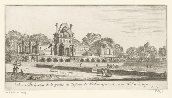 Editor: Here we have Israel Silvestre’s 1652 ink drawing, "View of Part of the Castle of Rochefoucauld". It feels very ordered, almost regimented. I'm interested in how he built up the image through repetitive, delicate lines. What do you see in this piece that I might be missing? Curator: I see a carefully constructed presentation of power through the depiction of materials and their manipulation. Look at how Silvestre renders the stone of the castle – its imposing size, the labor required to quarry and shape it. The rigid geometry of the garden reflects control over nature, a very visible display of wealth. What does this level of artifice say about social structures in the 17th century? Editor: So, it's about the materials communicating something larger? The castle’s not just a building, it's a statement about resources and labor. And the ink, the lines, become evidence of Silvestre's own labour too, in documenting that power. Curator: Precisely. Consider the distribution of that labour. The creation of this image involved Silvestre, the etcher excudit, and even the publishers indicated at the bottom left, all of whom took a certain skill to produce and make accessible. Then there are all those working for Rochefoucauld... This wasn't a spontaneous sketch; it was a carefully planned articulation of authority manifested through architecture and land management. Think about how that's being consumed and disseminated across different social circles at that moment. Editor: It reframes the drawing. Instead of just a pretty view, it’s a record of social and material investment. So, understanding the process and materials helps decode the artwork’s deeper meaning. Thanks! Curator: Indeed. Examining art through the lens of production allows us to appreciate it not just as aesthetic object, but as a cultural artifact embedded in its time. A good eye is only the beginning!
