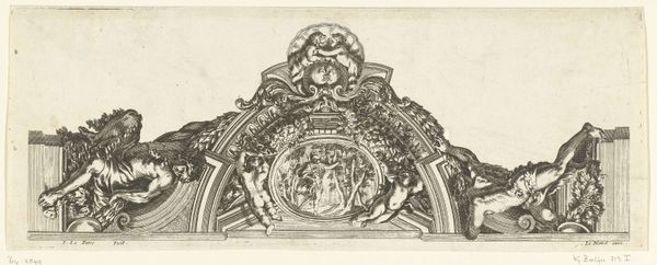 Editor: Here we have an engraving from between 1591 and 1633, titled "Ornamentomlijsting met rolwerk en figuren, waarin landschap met de Barmhartige Samaritaan." It's attributed to an anonymous artist and is currently housed at the Rijksmuseum. The ornate frame surrounding the landscape immediately grabbed my attention. What formal elements do you observe that stand out to you? Curator: The dynamic interplay between the central image and its elaborate frame presents a fascinating formal problem. The artist constructs a hierarchy of visual information, yes? Notice how the landscape, rendered with delicate precision, is contained within the bolder, more assertive lines of the ornamental border. How do you think the composition's structure guides the viewer's eye? Editor: Well, the frame definitely draws you in first, and then your eye is led to the more serene landscape in the middle. It's like two contrasting worlds coexisting. Do you see the starkness in the images contained as symbolic? Curator: Exactly. Semiotically, consider the frame itself. What is it doing with respect to boundaries and containment? Its intricate patterns—the scrollwork, the figures—compete for attention, creating a tension between surface and depth. Do you perceive any relationships or disruptions with how they correspond within this symbolic relation? Editor: It seems disruptive—the figures look classical and idealized, while the landscape is more naturalistic. It's almost like the artist is juxtaposing different styles to make a point, creating a dialectic relationship. Curator: Precisely. The structural opposition enhances our understanding of the image’s inherent dichotomies – the artifice of ornamentation versus the apparent authenticity of nature. Think about it. Editor: That is something. Looking at it through a formalist lens really sheds light on the power of composition and structure. I appreciate the image more when breaking down its artifice. Curator: It exposes inherent oppositions to highlight something that could have previously been lost in subjective analysis. Thinking of art as an intersectionality that must meet certain needs.