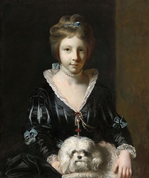 Editor: Here we have Juan Bautista Martinez del Mazo's oil on canvas portrait, *María Teresa, Infanta of Spain*, dating from the 1640s to 1650. It's immediately striking how young she is, and how heavily she is adorned with symbols of wealth. What can you tell us about what all this signifies? Curator: The weight of dynastic expectation rests heavily in this image, doesn't it? Even the small dog is symbolic of fidelity, echoing the expectation of her future role. Look closely – how is María Teresa presented as both an individual and an emblem? Editor: Well, her face seems quite individual, but the formality of her dress and pose, and the presence of the dog, definitely project an idea of royalty more than anything personal. Is that typical for portraits of this era? Curator: Absolutely. It speaks to the conventions of royal portraiture, intended less to capture personality and more to communicate status and destiny. The seemingly simple elements of dress, the careful gesture of her hand, and even the subtle richness of the background all function as symbolic language. Think about the colours—how do they work together to express power? Editor: Now that you mention it, the red and black combination is hard to miss, almost like a visual announcement. I hadn't considered the background colors as adding to that! Curator: And the lace. Have you considered the craftsmanship required for the lacework and what it represents? Its fragility contrasts sharply with the expectations thrust upon the Infanta. Every detail builds a complex visual narrative. Editor: I’m starting to see how each part, from the lace to the dog, reinforces this idea of her role and future responsibilities. Thanks, that really brought the symbolism into focus. Curator: It's amazing how much cultural memory is packed into a single image. Hopefully it encourages everyone to look a little closer.