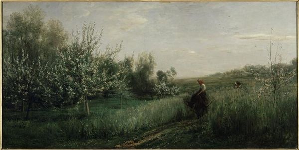 Curator: "Spring Landscape," an 1862 oil painting by Charles-François Daubigny. What strikes you first? Editor: It feels muted. Even with the suggestion of spring, the color palette is incredibly subdued, dominated by greys and soft greens. The brushwork seems deliberately loose. Curator: Absolutely. Daubigny's commitment to painting en plein air encouraged such directness. Consider the time—France was on the cusp of significant social and political upheaval. Did such art allow room to question oppressive societal forces? Editor: I'm drawn to how the composition itself almost feels like a stage. Note the recession created by the path in the foreground, drawing us in. And observe how that central cluster of trees, practically bare, disrupts the middle ground. Curator: And see the figures there, right? This is where intersectional analysis gets juicy. Who were those people? How did gender or class affect their interactions within that landscape and did art become a tool for exploring complex questions of agency? Editor: Perhaps, but Daubigny clearly manipulated value, using light to guide our vision in particular directions, and that is just good compositional technique. Curator: Of course! That manipulation serves purposes, aesthetic or ideological. Looking closely at this landscape tells stories beyond what is seen: about who holds power. Even those muted greens evoke nature not as idyll but arena. Editor: Perhaps, but in focusing so much on the historical circumstances do we risk losing sight of how masterfully Daubigny balances textures, from the wispy trees to the soft grass? Curator: That very balance echoes class imbalances present throughout French society. Considering what landscape art means in 1862 makes us engage with what's deliberately chosen. Editor: Fair enough. Maybe a successful painting like "Spring Landscape" functions on multiple levels simultaneously: as aesthetic feat and also as loaded artifact within its time. Curator: Precisely. It prompts viewers to examine landscape's inherent power—and that continues reverberating in current debates about representation and justice. Editor: I agree, focusing on the technical skill together with its meaning in art history opens pathways for more perspectives.