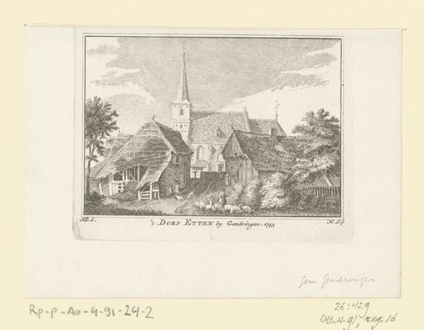 Curator: Ah, isn’t this lovely? We’re looking at Wilhelmus van Groenewoud’s "Dorpskerk van Voorschoten," dating back to 1834. It's currently held here at the Rijksmuseum. A very peaceful, serene scene. What are your initial thoughts? Editor: It feels very… deliberate. The meticulous hatching in the engraving emphasizes the structure of everything – the church, the trees, even the reflections in the water. It's a landscape, yes, but really about built structures. Curator: Absolutely. The medium itself, printmaking, speaks to that desire for replication and order, doesn’t it? He's captured the scene with incredible precision. Notice how the towering church looms, yet the people are quietly fishing. It strikes me as the contrast between spiritual aspiration and earthly concerns. Editor: Right, but the 'earthly concerns' are all bound up in that church too, aren’t they? Look at how centrally positioned it is, how all paths, even that canal, lead to it or away from it. And that's no accident; it's literally etched into the composition! The work reminds me about the Dutch economy's investment and social importance to religion at the time, made visible by the buildings and daily habits depicted. Curator: It also feels nostalgic, a longing for the simple rural life—perhaps a constructed simplicity. What’s interesting is the deliberate inclusion of everyday folks. Not idealized figures, but individuals engaged in daily activities, grounding this somewhat lofty structure into a more humble and relatable sphere. Editor: Indeed! Look at the labor and resources poured into that steeple though; materials hauled, skilled stone masons employed. It signifies labor transformed into capital and social dominance through architecture, while figures engaged in everyday labour look upon this display. Curator: Perhaps the intention here was less a glorification of rurality and more an honest appraisal of the place the Church held in Dutch life and landscape in 1834. Something quiet and contemplative about accepting it as it is. Editor: Perhaps! Thanks to the choice of engraving as a material form, and the way Van Groenewoud presents this village so carefully, the image lets us contemplate what makes a landscape more than just scenery – buildings, sure, but also power, belief, and labour too. Curator: It gives one a lot to think about! A potent image—quiet but complex—reflecting an era gone by.
