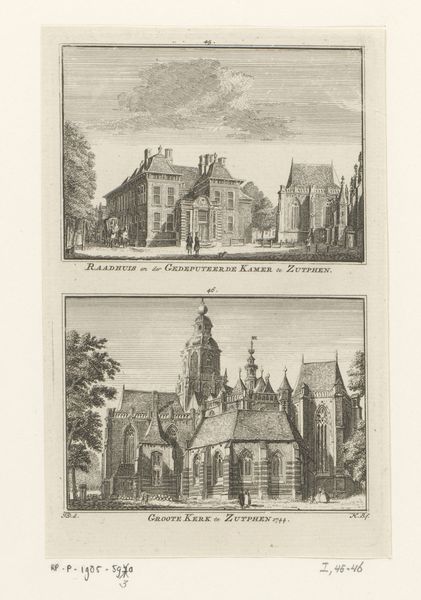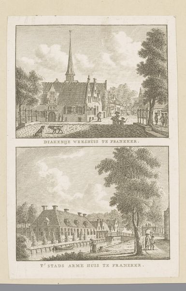 Curator: Here we have Hendrik Spilman’s “Gezichten op Huis het Park te Arnhem, 1744,” created sometime between 1745 and 1774. It combines drawing and engraving on paper. The Rijksmuseum is its current home. Editor: My initial feeling is of meticulous detail; the architecture is painstakingly rendered, but the light seems very muted, almost austere. Curator: Indeed, Spilman, working in the Dutch Golden Age and Baroque styles, certainly prioritized architectural accuracy. The materials speak to that era—drawing and engraving were key methods for disseminating images, acting as visual records, you know, almost like a very detailed photograph before photography. The print allowed it to be replicated, democratizing the image for broader consumption. Editor: I'm drawn to the almost dreamlike quality that emerges from its details. I can see how the architecture, especially that stepped gable and central tower, are signifiers of status and ambition of the residents in Arnhem society. Water elements appear both like protection and a means of transportation in an intricate relationship. I feel as if it creates layers of interpretation which point to this cultural memory and the building’s presence. Curator: Good point. While the grand design alludes to social standing, don’t overlook the paper itself, a valuable commodity. The very act of creating and distributing such images, showcases networks of skilled labour from papermakers to printers to engravers all active for wider access to knowledge. It offers a small window into 18th-century market. Editor: The perspective gives it a distant and idealized feel for what Arnhem society must have perceived and felt as the reality for social-economic classes at that time. Curator: Looking at this interplay between the means of representation and their meanings in the depicted structure as power symbol of 18th-century in the Netherlands certainly grants the historical context in new, fascinating insight. Editor: Agreed; its symbols certainly evoke reflection upon a city life of class and cultural resonance for us today.