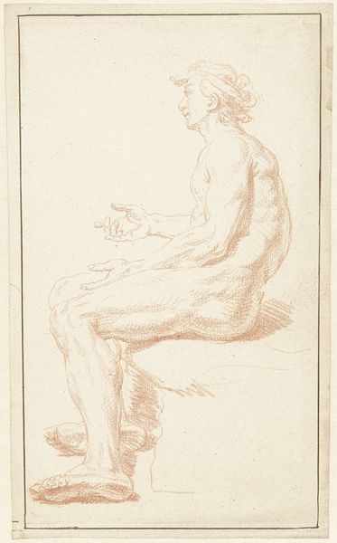 This is a pencil drawing of a seated male nude, made by Jan Hoogsaat in the 18th century. The figure's most striking feature is his pointing gesture. The extended arm and index finger echo classical traditions, reminiscent of Plato or Aristotle in ancient depictions. We see this motif repeated throughout art history, often signifying instruction, guidance, or accusation. Consider Da Vinci’s John the Baptist, where the gesture takes on a spiritual dimension, directing our gaze heavenward. Yet, here, Hoogsaat's figure complicates this inherited symbolism. His furrowed brow and downward glance infuse the gesture with a sense of unease. What is he pointing at? Is it a warning, or perhaps an indictment? This ambiguity stirs something primal within us, tapping into a collective memory of judgment and moral reckoning. It is a potent symbol of humanity's ongoing struggle with morality and direction.