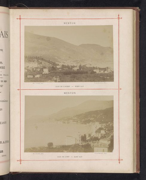 Curator: Let's discuss these two images, "General View" and "Grand Hotel," taken by Albert Courret, likely before 1886. They're presented as albumen prints within what seems to be a larger album. Editor: Immediately, the overriding sense I get is one of tranquil order, almost utopian. The compositions are calm, very carefully structured, and they communicate a real sense of place. The muted tones add to this feeling of serenity. Curator: Courret worked extensively in the late 19th century, producing many photographs of Mediterranean locales. I'm interested in what the production of these images meant during a period of intense colonial activity and the development of European tourism. This photograph is far from objective, is it? Editor: Absolutely not. The "General View" depicts a rather picturesque town nestled in the hills. Note the visual balance between the built environment and nature. It recalls classical landscape painting; however, this constructed, peaceful image, undoubtedly romanticizes the area. What cultural tropes are being enforced? Curator: It’s definitely packaged for a Western audience, perhaps to sell an idealized version of Mediterranean life. Consider the Orientalist style present, it’s subtle. Even this style enforces and presents the Western view of "the East," right? There’s a tension here, particularly when considering what’s intentionally left out, the more difficult elements of colonial life. Editor: The symbol of the "Grand Hotel" itself is also really compelling here, too, a bastion of Western culture imposed upon the landscape. What statements about power, culture, and privilege are visible here? The architecture feels so deliberately placed, in stark contrast with its surroundings. Curator: These images operate on multiple levels. On the surface, we have seemingly innocent photographs. But underneath, we see layers of cultural encoding, assumptions about travel, leisure, and a clear power dynamic between the photographer, his subject, and his likely audience. Editor: And by presenting these images as parts of an album, it suggests that it is but a sample in a much broader experience being marketed. The sense of curated experiences and of memory feels palpable here, even though it is from so long ago. This romantic idealism certainly sells very well. Curator: Exploring art in this way highlights how even seemingly straightforward landscape images are never truly neutral. Editor: And by focusing on how imagery operates, we can begin to understand why some survive the passage of time and continue to hold symbolic importance. Thanks for guiding me on this.