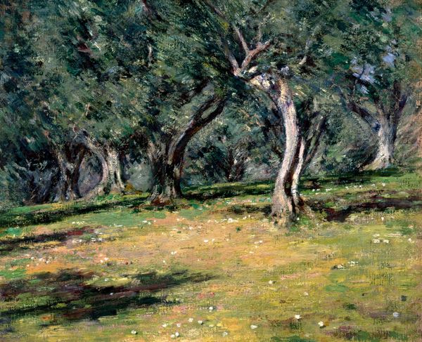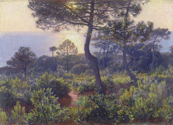 Editor: Theo van Rysselberghe's "Pines of Rayol," painted in 1912, showcases pine trees along a coast. The shimmering effect, created with what looks like oil paint, almost dissolves the forms. What's your take on this painting? Curator: Let's consider the physical act of making this piece. Van Rysselberghe, influenced by Neo-Impressionism, applied paint in tiny, deliberate strokes. It was painstaking labor, a direct contrast to the fleeting, "natural" scene he depicts. Where was this scene manufactured? Editor: I believe "Pines of Rayol" was painted en plein air, in direct contact with nature. Curator: Precisely. Think about the materials brought outdoors. Canvas, easel, paints manufactured elsewhere. He then applied these to represent a seascape, a place shaped by natural forces. The means of production and consumption are intertwined, isn't it interesting? Editor: It is, yes. Is he trying to make a statement by using this manufactured paint, and those man-made materials in a seemingly untouched area of nature? Curator: Perhaps not consciously a "statement," but it highlights the complex relationship. It reveals how our very act of observing and representing nature involves industrial processes, consumerism. Does that challenge any assumptions you had? Editor: Absolutely, I hadn’t thought about the painting as an industrial object itself. Thank you for widening my perspective on this work! Curator: My pleasure! It reminds us that even seemingly naturalistic scenes are products of material processes and social forces.