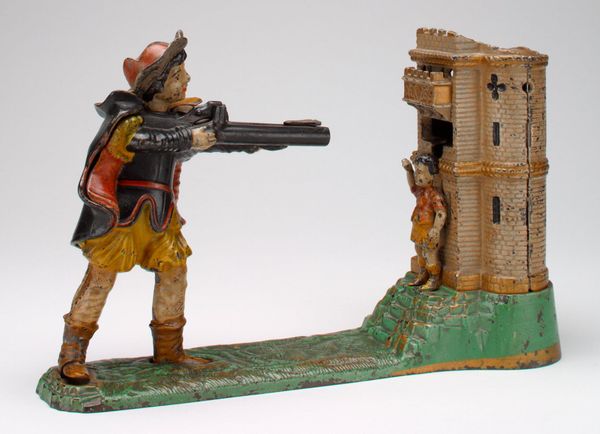 Curator: This fascinating object is called "-New Creedmoor- mechanical bank." It dates back to about 1891. Editor: It’s so...grim. Like childhood and warfare oddly colliding. All those hard edges, and the oddly stiff posture of the marksman...it almost has a toy-like quality and it does actually make me think about violence and saving at the same time! Curator: Exactly! It's made of painted metal, likely cast iron. Mechanical banks like this were designed to encourage saving, often with a performative element. The act of depositing a coin becomes a miniature drama. Editor: A drama involving weaponry and…tree stumps? I mean, that aim, that serious little face – and is he aiming at that tree? It has such a stark, storybook feel that could maybe serve as metaphor. It must be quite fun and intriguing to use though! Curator: The mechanics are intriguing. When a coin is placed in the rifle, a lever is triggered, causing the figure to “fire” at the tree, depositing the coin inside. Consider the historical context: late 19th-century America, with its growing industrialization and a rising middle class keen on teaching children about thrift and patriotism. Editor: Thrift, yes, and perhaps subtly acclimating them to...marksmanship? This little bank says a lot about those times. Look how cleverly that figure is fashioned: a brave posture while standing on what is perhaps a mound and aiming at…well, that little gap in the stump. You start wondering who invented these kind of games. Curator: These banks served as tools of social conditioning, reflecting societal values regarding labor, capital, and even military prowess. The materiality of cast iron, the mass production...it's all part of the message. This item isn't just kitsch; it's material culture, encapsulating the anxieties and aspirations of a particular era. Editor: That’s so very accurate, material culture. These little treasures become very loaded time capsules when analyzed from today’s perspectives. Thank you for pointing those key components to appreciate about this piece. I came away feeling much more contemplative.