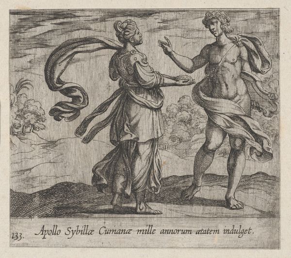 This is Antonio Tempesta’s, Plate 15: The Daughter of Croneus Changed into a Cow, an engraving dating back to the late 16th or early 17th century. The composition, dominated by sharply defined lines, captures a moment of dynamic transformation. The figures, rendered with meticulous detail, exhibit a clear contrast in form and texture. Note the fluid lines suggesting movement in the water compared with the rigid definition of the figures. This contrast destabilizes any fixed reading. We see not just a mythological scene, but an exploration of changing forms, with the artist using line and texture to highlight the instability of identity and the metamorphic processes that challenge our understanding of permanence. The visual language of the artwork, with its precise lines and careful arrangement, serves not just to illustrate a myth, but to engage with broader philosophical questions about change and being.