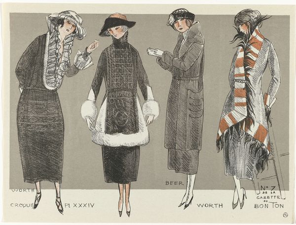 Editor: So this is "Gazette du Bon Ton, 1920 - No. 7, Croquis Pl XXXIII: Lanvin / Beer / Lanvin," a drawing by Fernand Siméon. It feels like a peek into the aspirations and aesthetics of the time, very stylish and maybe a bit reserved. What draws your eye in this piece? Curator: The work is fascinating as a document of its era, showcasing the shifting roles of women in the 1920s through fashion. Look at the designs - Lanvin and Beer were at the forefront, weren't they? And what do their garments convey about the period's social dynamics, about gender and identity? Editor: They seem to be straddling tradition and modernity, like the dresses are elegant but also perhaps hinting at a newfound freedom? Curator: Exactly! These weren't just clothes; they were statements. Fashion became a visual language through which women negotiated their place in society post-war, and questioned the pre-war status quo. How does this relate to broader cultural movements like the flapper culture or the suffrage movement? Editor: It’s like the drawing captures that moment of transition, visually representing these evolving identities through the clothes themselves. Curator: Precisely. And notice how Siméon uses line and form – does it evoke a sense of liberation or restraint? How might the artistic style itself mirror the social tensions of the era? Editor: It's all so interconnected, isn’t it? Fashion, art, and social change all influencing each other. I'll never look at a fashion drawing the same way! Curator: It reveals the profound relationships between aesthetic expression, social justice and lived experience. I learned something today too, seeing this work through your eyes!