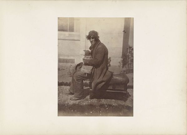 Editor: This gelatin-silver print, "Man met pijp leunend tegen een trap," created sometime between 1863 and 1914, captures a man with a pipe leaning against a stairway. He appears almost defeated in a snapshot, as if taking a break, yet the photographic work gives us intimate insight into a daily narrative. What do you notice first about the formal elements of this composition? Curator: The diagonal emphasis certainly establishes a structural tension. The precarious lean of the figure and the stark, geometric lines of the stairway create an interplay of balance and imbalance. Do you find that interplay extends beyond the composition to influence the reading of subjecthood? Editor: Yes, I'm inclined to see the image as symbolic, the way light and shadow play on his clothing seems intentional, perhaps highlighting his weariness while also celebrating the resilience of the human form. Can you say more about this tension? Curator: Observe the light. Its starkness draws a severe distinction. The flat plane contrasts to highlight its artificial construction, and forces an appreciation for texture rather than any naturalistic attempt to suggest that it exists in nature. Does it shift your initial reading to consider the relationship? Editor: Definitely, it’s a fascinating counterpoint, a dialogue between form and texture, between fragility and groundedness. It speaks volumes beyond its humble subject. Curator: Precisely. These elements—texture, light, structure—orchestrate a visual poetry independent of literal interpretation. I'm particularly interested in the surface quality that you raised. It allows an appreciation beyond social documentary to become abstract form. Editor: It’s truly shifted how I perceived it – focusing on the interaction of compositional forms first opens the artwork in exciting directions. Thanks for illuminating these relationships!