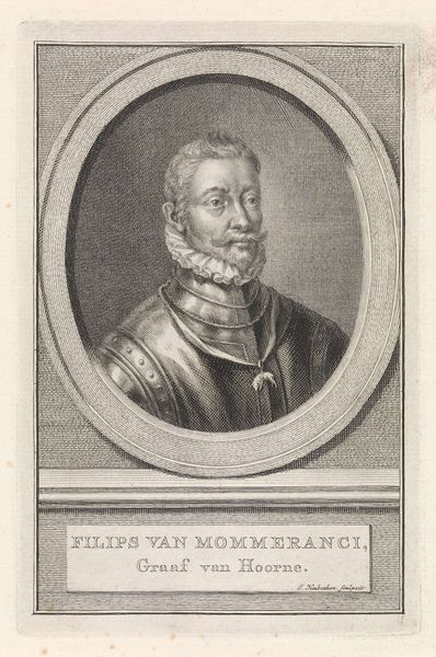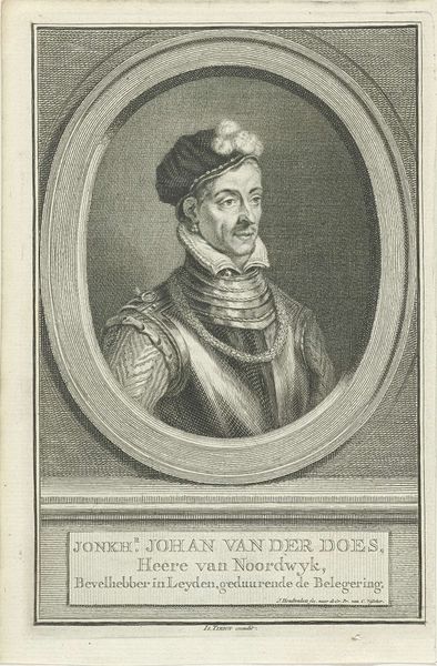 Editor: Here we have Jacob Houbraken’s "Portret van Johan van der Does," an engraving from around 1772 to 1774. The incredible detail achieved through this medium is really striking, especially in rendering the textures of the metal armor. I am immediately drawn to the visual contrast within the portrait. What stylistic elements are particularly noticeable here? Curator: Observe the compositional structure inherent within this portrait; the subject is encased in an oval frame that is perfectly centered. The interplay of light and shadow delineates the planes of his face and armor, enhancing their three-dimensionality. Notice the precise hatching and cross-hatching that generate tonal variations. Can you discern how these technical aspects guide your perception? Editor: It seems the stark contrasts direct the viewer's eye immediately to van der Does's face and the reflective quality of his armor. It emphasizes his features. I see the lines add texture but do the varying weights carry significance in terms of symbolic meaning or status? Curator: The varying line weights and densities structure our understanding, the dark areas provide solidity and structure. We cannot overlook the relationship between the subject and his frame—how does that containment influence your reading of the portrait? Editor: Well, the frame gives the image structure, which may symbolize formality and power but also a level of restriction as the sitter is constrained inside it, giving off a sense of limited power perhaps? Curator: Intriguing thought. This close reading helps in understanding the image’s complex composition. Editor: I will look more closely at the construction of lines now in prints and portraits.