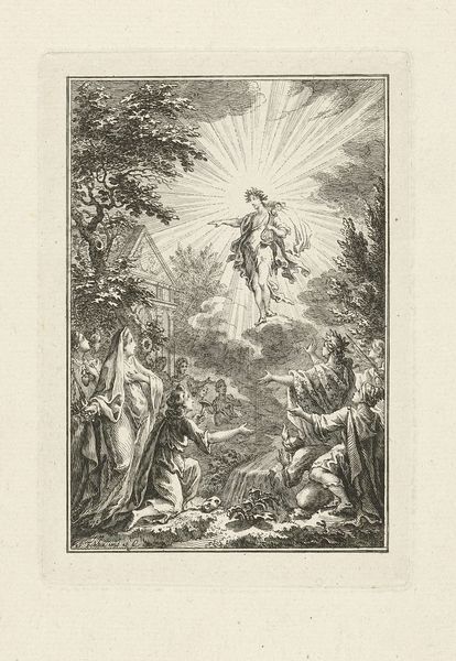 Editor: Standing before us is "Allegorische figuren nabij de heuvel Golgota," or "Allegorical Figures near Golgotha," a drawing made between 1722 and 1784 by Simon Fokke. It’s currently housed at the Rijksmuseum. It's a detailed engraving, quite dramatic, with lots of symbolism going on. I find the contrasts between light and shadow particularly striking. What's your interpretation? Curator: Oh, this piece! It whispers stories of faith, doubt, and the ever-present tension between earthly and divine matters. Look at the allegorical figures; it feels as if Fokke is inviting us to reflect on humanity’s relationship with sacrifice. Isn’t it curious how the serene classicism of the seated figure contrasts with the more ethereal, almost ghostly figure beside her? What do you think that contrast represents? Editor: It could be earthly knowledge meeting spiritual wisdom? Curator: Perhaps! And that Golgotha in the background – almost a faint memory, a whisper of the immense suffering, a stage, even. Fokke packs such an emotional punch in such a delicate, precise medium, doesn’t he? It’s like peering into a Baroque dream. A moral one, to boot. It makes you ponder the weight of belief, wouldn't you say? Editor: It does make me think, almost like a conversation starter rather than a simple statement. Curator: Precisely! And in that spirit, art perpetually beckons; ever reflective.