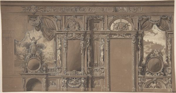 Editor: So this is “Design for Two Chimneypieces,” made sometime between 1655 and 1675. It’s anonymous, rendered in ink and print. Looking at the design, I’m struck by the ornate, almost symmetrical balance, and the stark contrast created by the ink. What compositional elements stand out to you? Curator: Observe the distinct spatial organization: two chimneypieces, each a self-contained unit, yet mirroring each other to create a balanced composition. Note how the artist utilizes linear perspective and the meticulous application of ink to define form and create depth. How do these linear structures create planes and dimension? Editor: I notice the prevalence of curved lines and figures against the more structured geometric frame of each design; specifically how the cupids act as structural supports of the top section on the left and top middle section of the piece on the right. Is this contrast in shape purposeful? Curator: Precisely. The opposition of organic, flowing lines with the strict geometry of the frames creates visual tension and complexity. The figures serve a dual function; support and ornate visual. It merges form with function. How do you view the application and distribution of ink, light, and dark? Editor: Well, the darkness highlights certain areas. The frame of the right panel has significant shading, making it "pop." Conversely, lighter areas denote other sections. But without the light areas, the figures would likely fade into the shaded background. So contrast plays a major role. Curator: Precisely! Through close analysis of form and materiality, we can discern the intent to harmonize diverse compositional strategies, culminating in complex unity. Editor: Thanks for your expertise; I see so much more in the relationships between the line and shapes now!