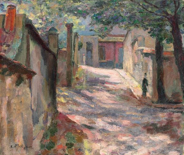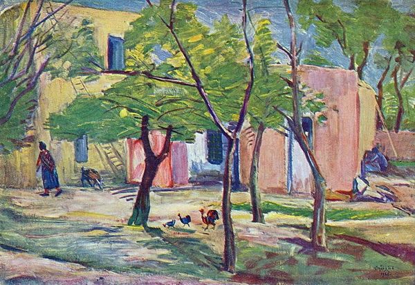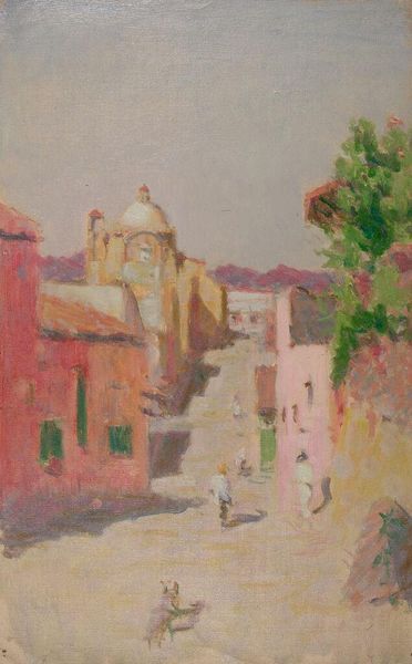 Curator: This is Dodge Macknight’s watercolor, "Street with Pines, Fontvieille." There's no specific date associated with the work. Editor: It’s so evocative. The pale washes create a dreamlike, almost nostalgic atmosphere. What medium did Macknight employ here? Curator: Macknight clearly revels in the properties of watercolor. The way the pigments pool and bleed creates a sense of light and heat, evoking the South of France. It makes me consider the legacies of colonialism and its impact on artistic representation. Editor: Yes, and the visible brushwork and the texture of the paper itself are so critical. I find myself considering the relative ease of production afforded by watercolors, compared to the intensive labor involved in an oil painting. Curator: Absolutely, it's fascinating to consider how place informs artistic practice, and how art, in turn, shapes our understanding of place, its people, and its socio-political history. Editor: Thinking about it from the perspective of the labor involved in creating images, I find it remarkable how much information Macknight conveys with such simple means. Curator: It leaves you with a lot to consider, doesn’t it? Editor: It certainly does. A simple image speaking volumes.